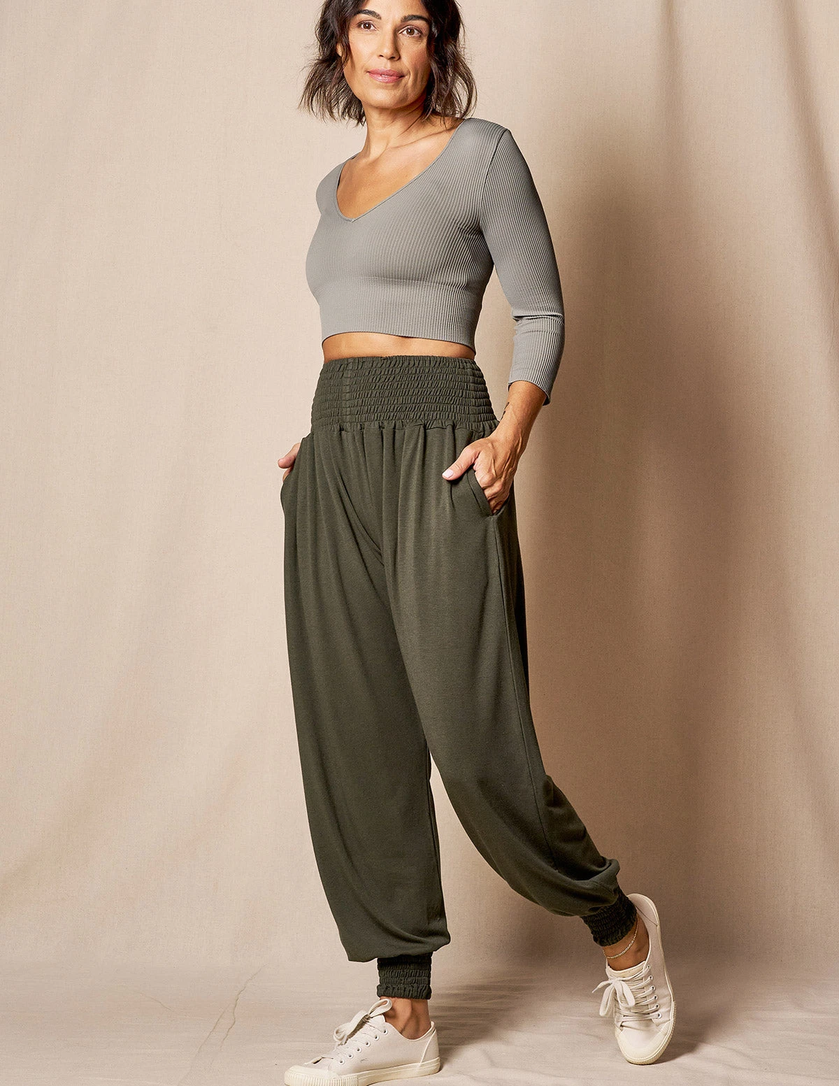This bestseller just got even better! So many customers asked for pockets on our most popular pants, we had to do it. Premium bamboo and organic cotton knit with a smocked waist and cuffs for a super trendy look. Ideal for those with sensitive skin. Super soft with rich color and a luxurious feel. Â