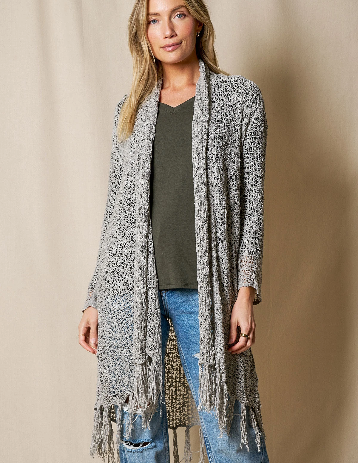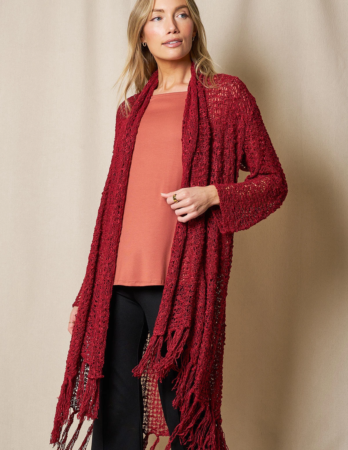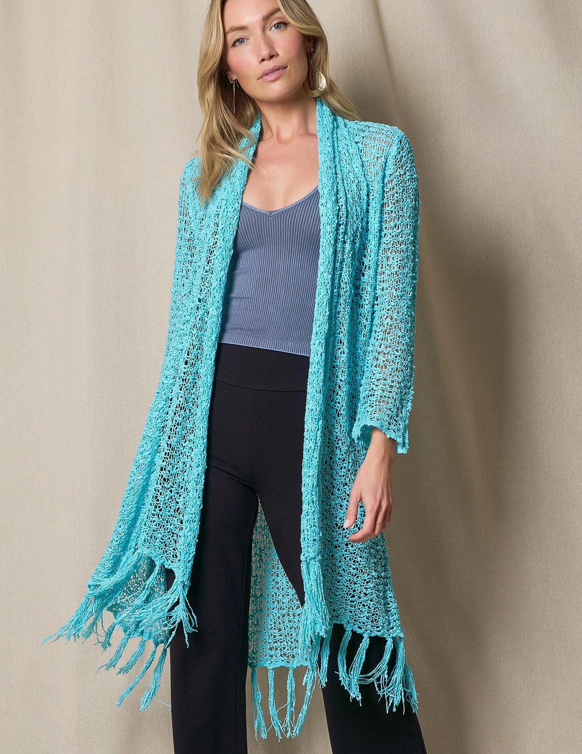 Luxurious Handwoven Riva Knit Duster makes the perfect topper for any look. Gorgeous color with open-front cardigan styling and fringe hem.