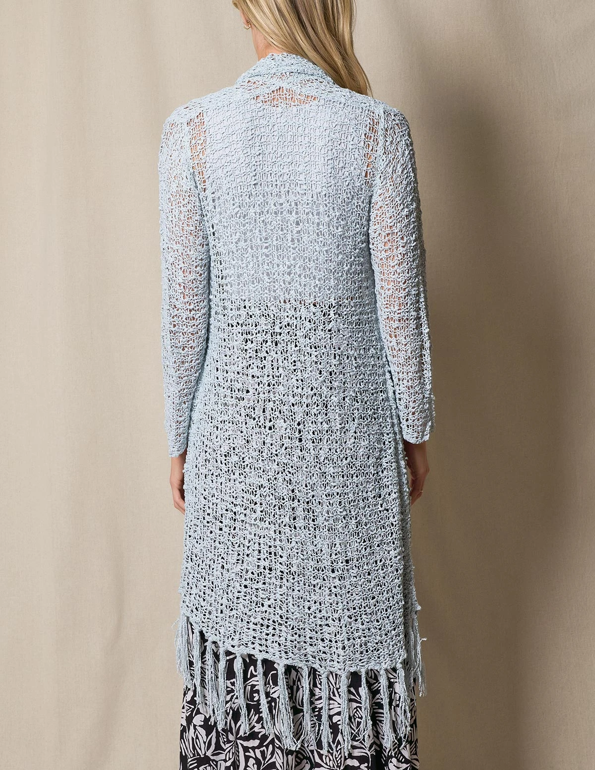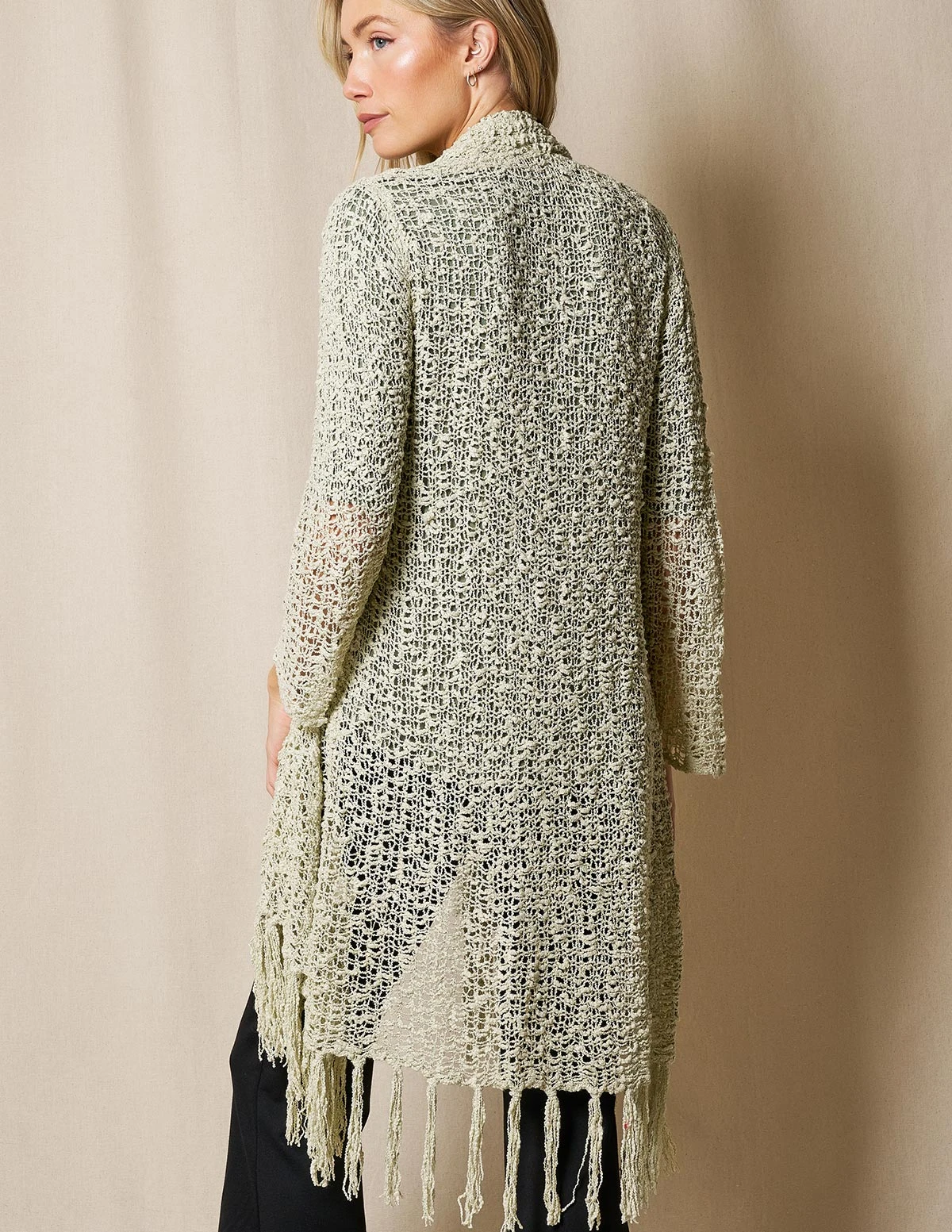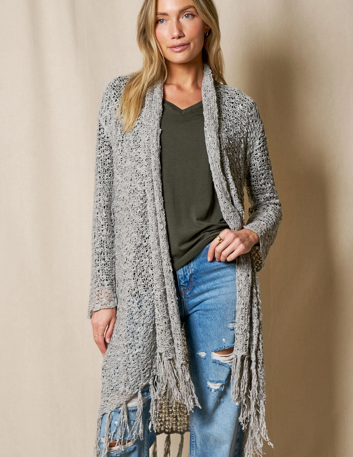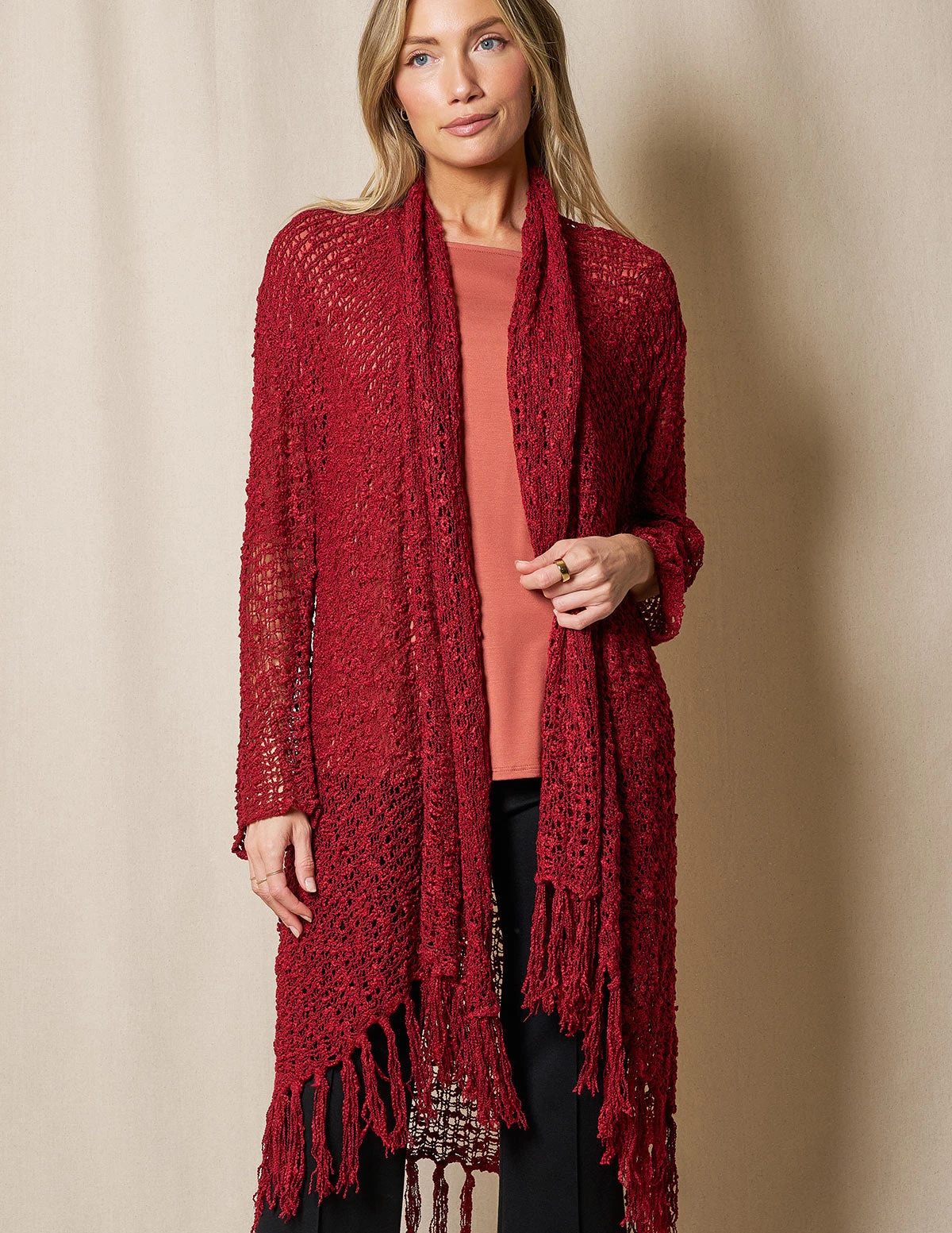 Luxurious Handwoven Riva Knit Duster makes the perfect topper for any look. Gorgeous color with open-front cardigan styling and fringe hem.