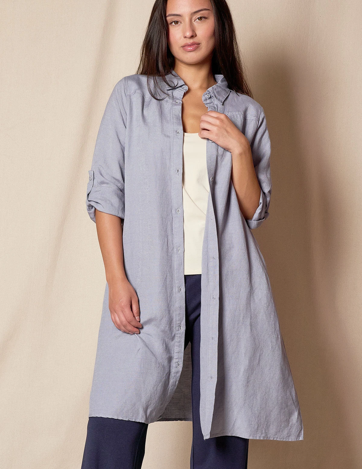 We love our premium exclusive blend of Linen and Bamboo so much, we designed a versatile shirtdress you will treasure. Effortless Style, Endless Versatility! This dress offers the timeless elegance of linen with the luxurious softness of bamboo. Designed to resist wrinkling, it stays crisp and fresh all day long. With its roomy silhouette, it can be worn as a dress or layered over as a long shirt for versatile styling options.